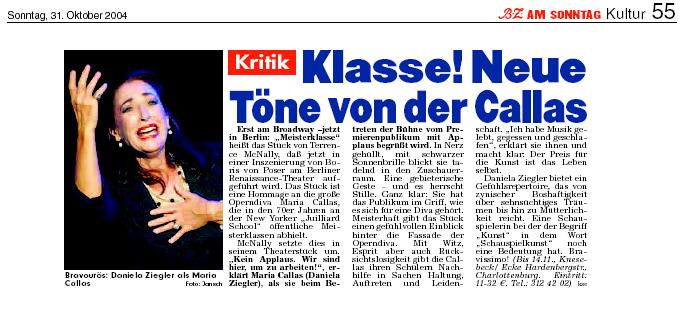 Kritiken zu Terence McNallys Meisterklasse mit Daniela Ziegler als Maria Callas Frühjahr 2004 im Ernst-Deutsch-Theater in Hamburg aus Hamburger Abendblatt, Hamburger Morgenpost, Die Welt, Herbst 2004 im Renaissance Theater in Berlin aus Tagesspiegel, Berliner Morgenpost, BZ, Zitty (Wiederaufnahmen im Mai und November 2005)